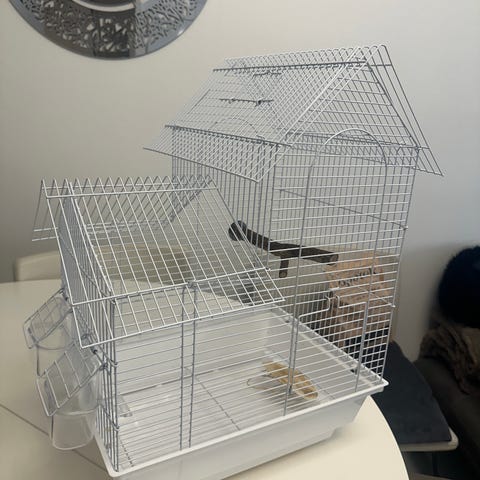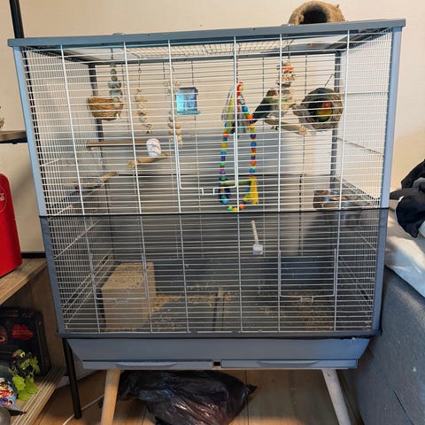 Stor fuglebur med masse legetøj og redekasse, vand og madskåle i rigtigt fint stand.