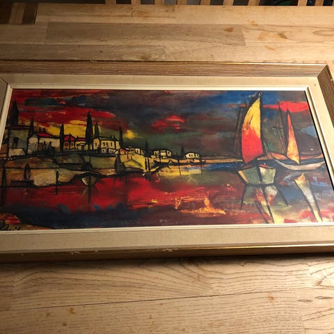 Flot maleri af et skib med stærke farver i en mørk ramme. Klar til at hænge op på væggen derhjemme.