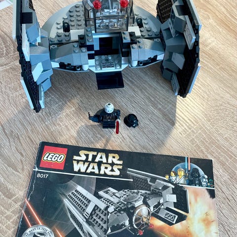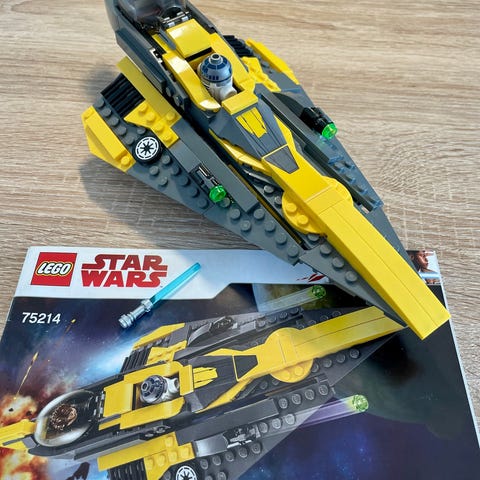 LEGO Star Wars sæt 75135 med rødt og gråt Jedi Interceptor rumskib. Der er også to minifigurer og et lyssværd med i sættet, inkl. samlevejledning.