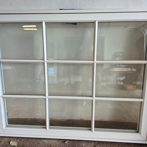 Hvidt vindue med sprosser, måler ca. 132,5 cm i bredden og 119 cm i højden.