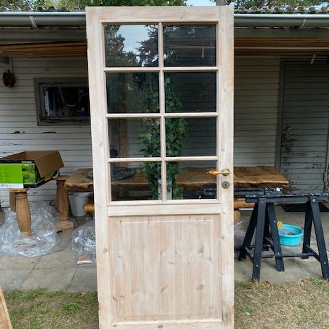 Trædør i fyr med flere glasfelter og fyldning nederst.