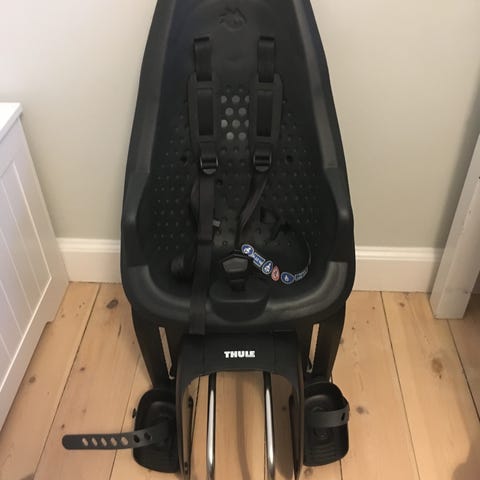 Thule cykelbarnesæde til børn op til 22 kg, i sort med justerbare fodstøtter. Har sele med spænde og ventilationshuller i ryggen.