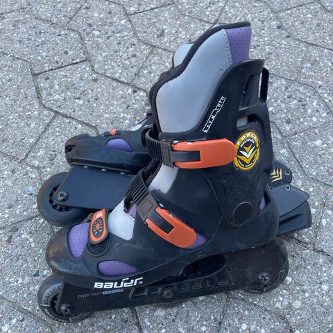 Bauer rulleskøjter i str 34 med sorte støvler og gule hjul. Snørelukning og polstret skaft, så de sidder godt om foden.