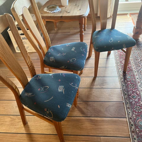 Spisebord i fyrretræ med stole. Der er 2 tillægsplader på hver 50 cm. Bordet opnår dermed en samlet længde på 260 cm.