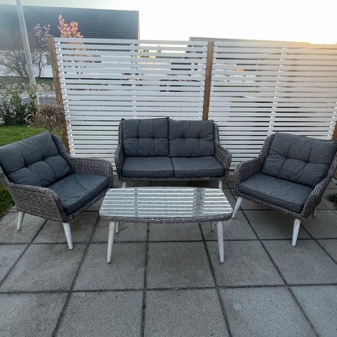 Rundt loungesæt i mørk flet med sofa, to stole og rundt bord med glasplade. Lyse hynder følger med til både sofa og stole.