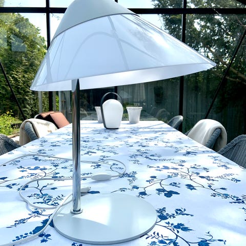 • Materialer: Slagfast opal akrylskærm, vådlakeret aluminiums-top, højglansforkromet stang, massiv stål-fod