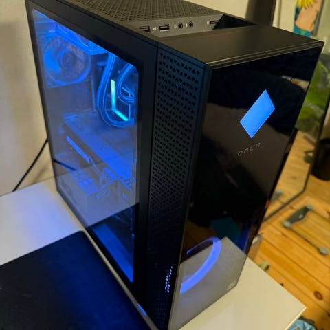 HP Omen stationær gamer pc med Intel Core i5, 16 GB RAM, 512 GB SSD og NVIDIA GeForce GTX 1660 Ti. Kabinet med sidevindue og lys samt flere USB-porte i toppen.