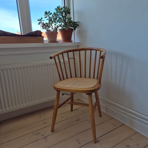 Træ i ryglæn og sæde, med lille læderpolstring. Sorte metalben.