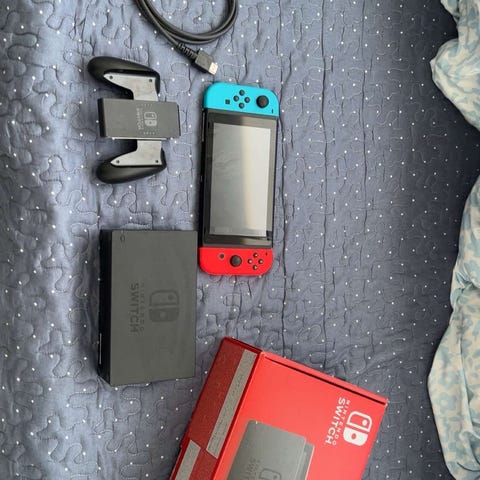 Nintendo Switch konsol med rød/blå Joy-Con sælges. Medfølger spil som Mario Kart 8 Deluxe, Zelda-titler og Minecraft samt et etui med rum til spil.