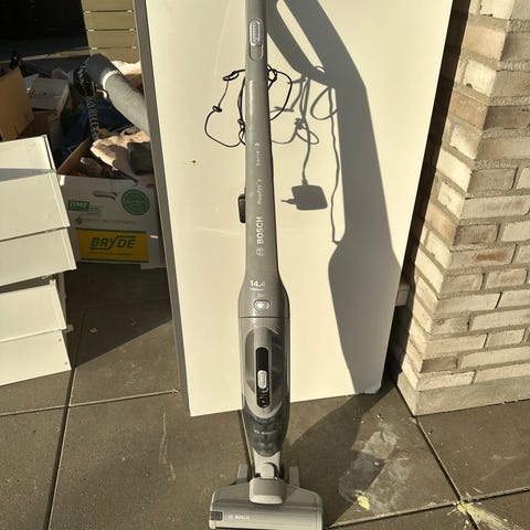 Bosch 2in1 ledningsfri støvsuger i sort med aftagelig håndstøvsuger. Har mundstykke for neden og en simpel knapbetjening på skaftet. Brugt et par gange men i så god som ny stand