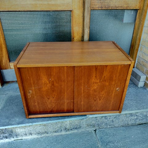 Fint lille træskab med én skuffe øverst og to låger med greb. Kommer fra røgfrit hjem.