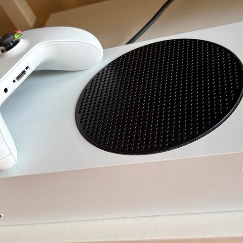 Xbox Series S hvid sælges, med den velkendte kompakte størrelse og stort rundt ventilationsgitter på toppen. Har den klassiske hvide controller og ligger i original æske.
