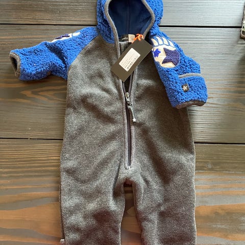 Joha uld heldragt i str 56 i grå/hvid striber med lyserøde kanter. Har trykknapper foran hele vejen ned og bløde ribkanter ved hænder og fødder.