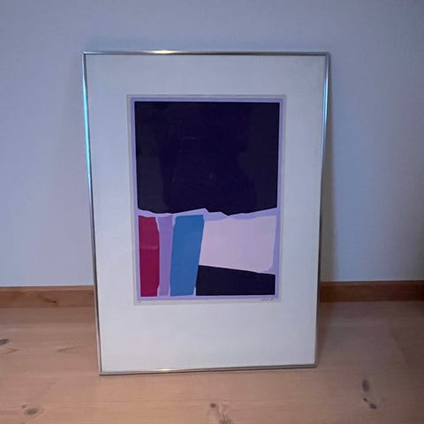 Samling af kunstplakater med to abstrakte motiver i blå/rosa nuancer og én plakat med Claude Monet Nymphéas. Alle er monteret i rammer og klar til at hænge op på væggen.