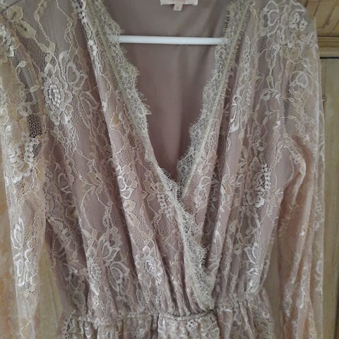 Guld festkjole fra Buch Copenhagen i str M i polyester med lange ærmer og V-udskæring. Har rynkedetalje ned foran og er glitrende i stoffet.