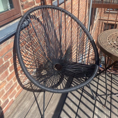 To sorte loungestole med rund form og snoreflet sæde, gode til altan eller terrasse. De er fra jysk og sælges samlet. Den ene er gået lidt i fletten men det gør intet for funktionen.