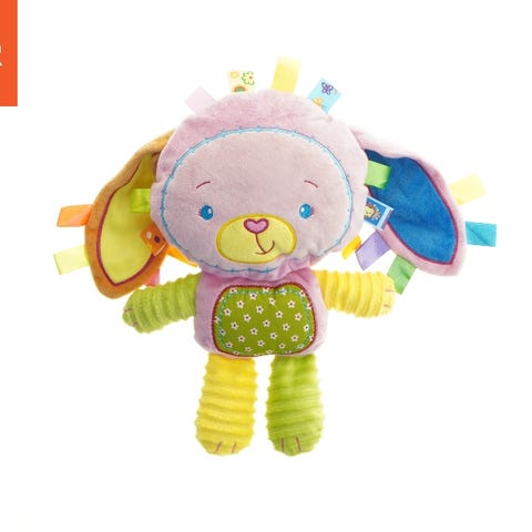 Sutteklud formet som en bamse med en blød teddyhoved og fløjlskantet krop. Den har dimensionerne 37x31 cm. Kluden er hovedsageligt hvid med rosa detaljer rundt om kanten og ved bamseørerne. Designet gør den ideel som komfortgenstand for børn.
