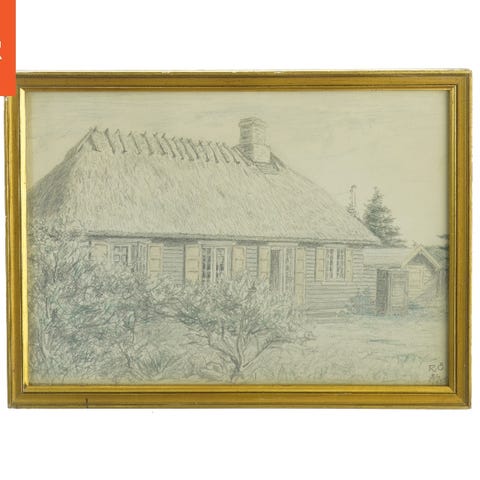 Maleri med et motiv af en landsbyscene, indrammet i en gylden ramme. Maleriet viser en traditionel landsbyhytte omkranset af frodig grønt. Det har en størrelse på 55x48 cm og er indrammet med en tråd på bagsiden for ophængning.