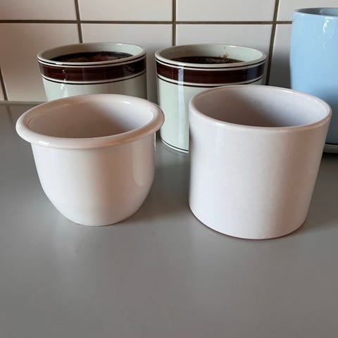Små blomster potter 3 hvide på 6 cm i diameter og 1 hvid og brun på 7 cm i dia. Pr stk 10kr og kan sendes