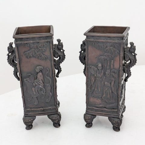 Et stort bronse-okimono, der forestiller en oni med en stor vase, Meiji-perioden, 82 cm høj, 30 cm bred og 21 cm dyb, i god stand, originalt/ægte, og underskrevet på basen med cartouche Seifūsai ju' 晴風斎鋳 og kaō. Klik på den blå "gå til varen" knap, for at købe eller byde på denne vare. Den samlede pris vil blive vist inden du afgiver dit bud.