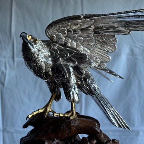 stort og sjældent bronze-okimono, der forestiller en oni med en vase og en ørn.