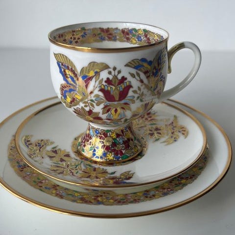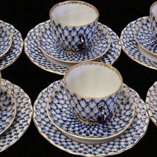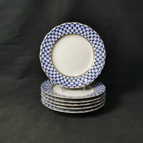 6 suppetallerkener fra Lomonosov Imperial Porcelain Factory i fremragende stand. Designer er Anna Yatskevich, navnet Cobalt Net. Diameteren på tallerkenen er 22,5 cm. Håndmalet og dekoreret med 22-karat guld. Anbefales til håndvask.