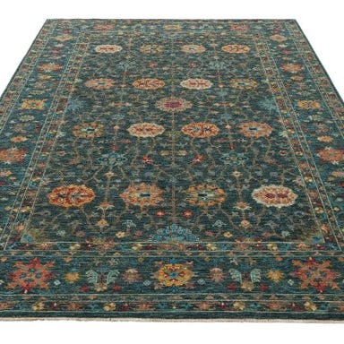 Stilfuldt håndknyttet designer-teppe med elegant floralt allover-mønster. Den harmoniske kombination af varm brun nuance og blide turkis-accenter giver tæppet en rolig, høj kvalitets udstråling og passer fremragende ind i både moderne og klassiske indretninger.