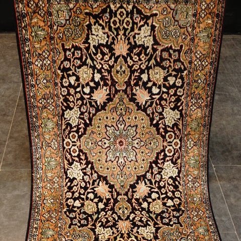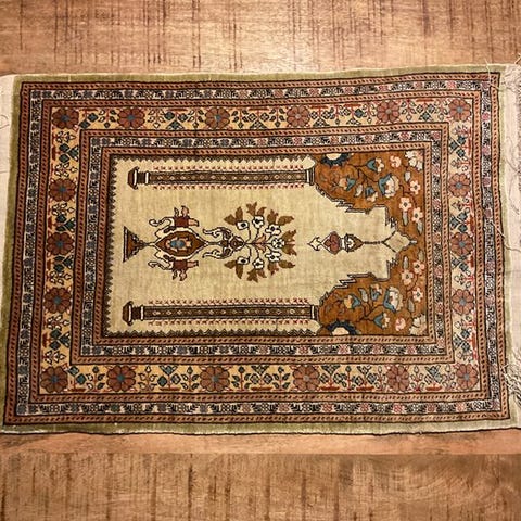 Indien, Kashmir-regionen — Model: Traditionelt håndlavet bedetæppe fra midten af det 20. århundrede, silke på bomuld, måler 130 × 89 cm, i særdeles god stand og professionelt renset. Klik på den blå "gå til varen" knap, for at købe eller byde på denne vare. Den samlede pris vil blive vist inden du afgiver dit bud.