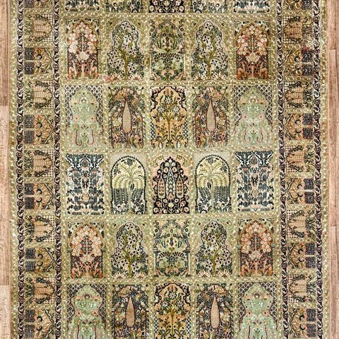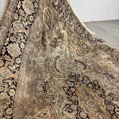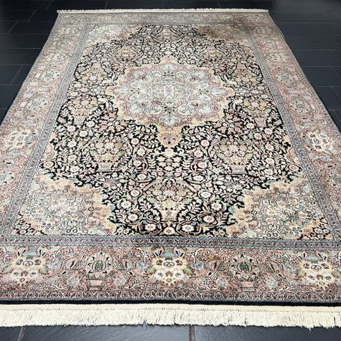 Høj kvalitet og ekstraordinær skønhed, original og eksklusiv håndvævet, og lavet af den højeste kvalitet silke på bomuld. Blomsterkonturerne fremhæves og fyldes med silketråd med et kortklippet, skinnende fleece. Tæppet er bekræftet med et certifikat for kvalitet og oprindelse. Orientalsk design med et imponerende medaljon omgivet af vidunderlige blomsterarrangementer og harmonisk kontrasterende farver får det til at se meget smukt og værdigt ud, når det udfoldes.