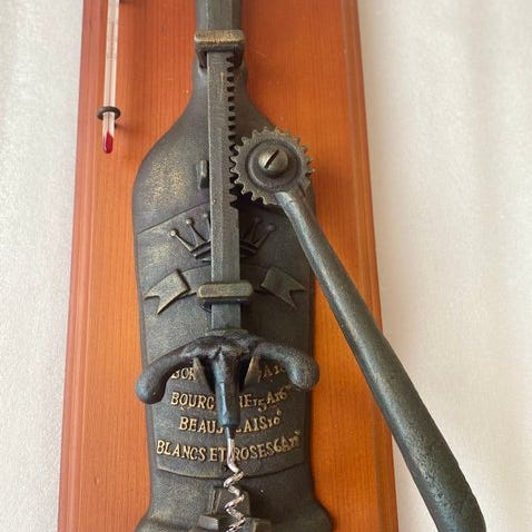 Description: En vintage samlerkorkskruer med vinpresse og fermenteringsfade som motiv.