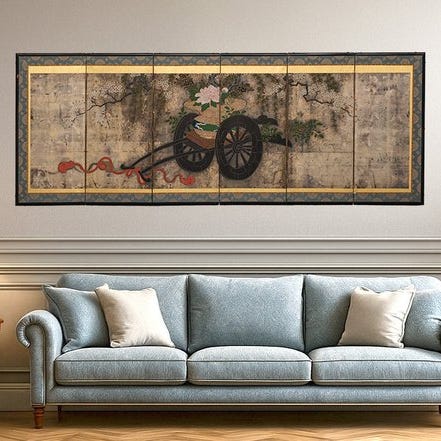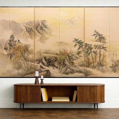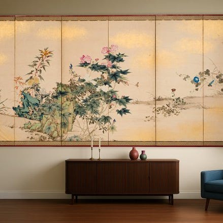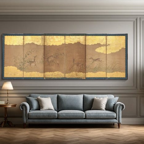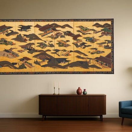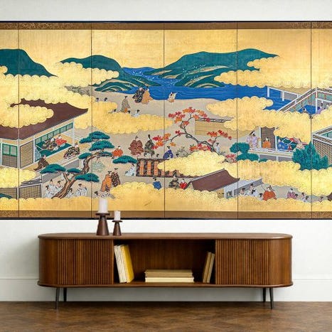 Et imponerende høj seks-panel byôbu 屏風 (foldeskærm) med en Tosa-skolens maleri af efterårs-scener fra Genji monogatari 源氏物語 (Genji Monogatari).