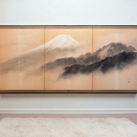 Et seks-panelet byōbu (屏風) med et bjerglandskab og et vandfald. - Papir - Jap...
