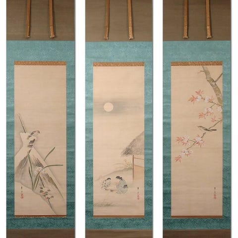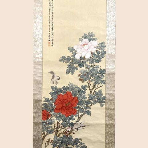 Meget fint maleri af fugle og blomster, signeret – inklusive tomobako - Silke...