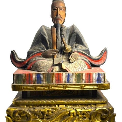 Stående figur af Fudô Myô-ô i polykromt malet træ, Edo-perioden, Japan, 77,5 cm høj, 30 cm bred, 22 cm dyb, i god stand og autentisk; ægthed bekræftet og ved forsendelsen medfølger et certifikat for ægthed. Klik på den blå "gå til varen" knap, for at købe eller byde på denne vare. Den samlede pris vil blive vist inden du afgiver dit bud.