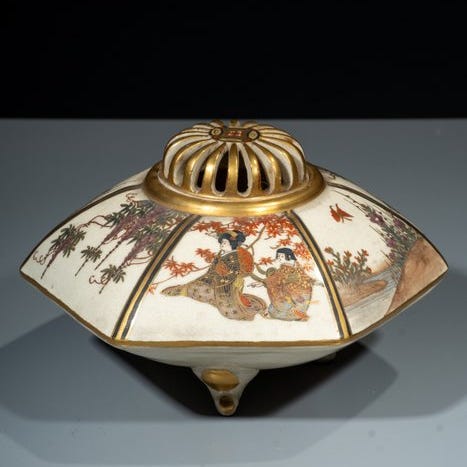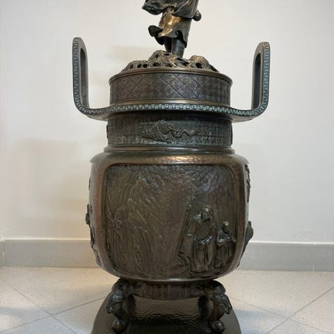 Et robust, men samtidig elegant firebenet røgelsesbrænder i mokkô-design med et sølvdækket kuppellåg med åbninger til ventilation, og udformet med tre kraner, der flyver gennem skyerne.