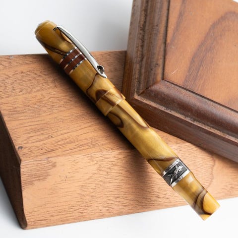 Kroppen og hætten på kuglerne er lavet af fornem italiensk resin i blå stribet farve, der repræsenterer institutionens alvor og betydning. Klippen, udført i