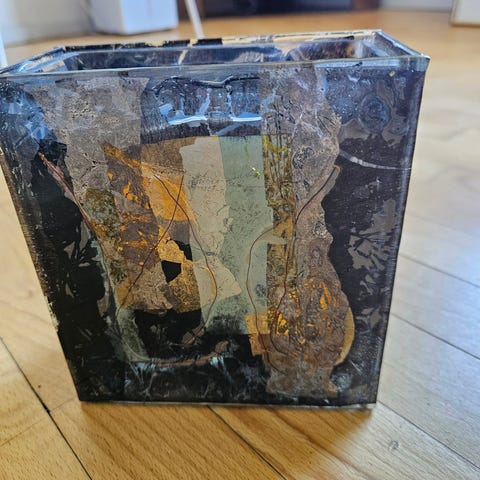 Værket er skabt med fusing-teknik og har masser af detaljer, herunder de karakteristiske gule spiraler, påsatte glaselementer og en smuk grøn ramme. Den giver et fantastisk farvespil, når lyset rammer glasset.
