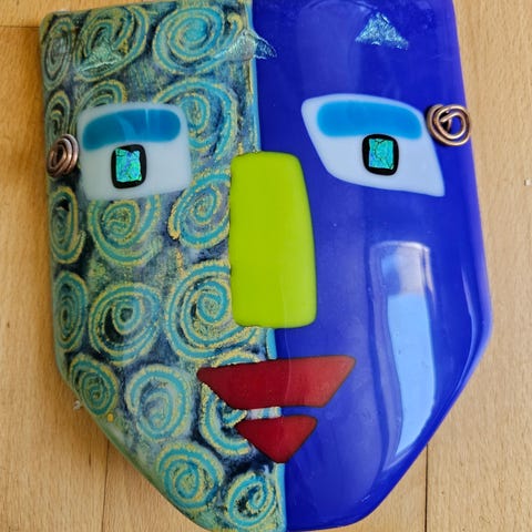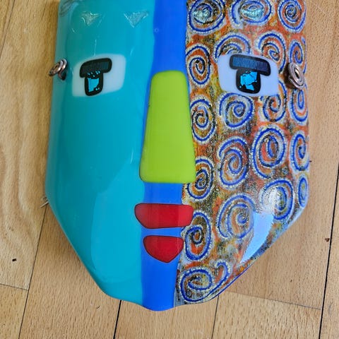 Sælger denne utroligt flotte og farverige glasmaske af den anerkendte danske kunstner Vibeke Skov. Masken er i en sjælden stor størrelse og fremstår i perfekt stand uden skår eller revner.