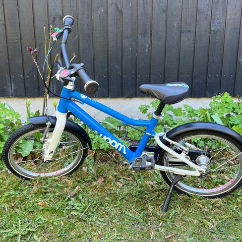 Cyklen har håndbremse, støttefod og lille cykelklokke på styret.