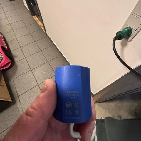 Roth termoaktuator 24V i grå til gulvvarme/varmeanlæg. Har ledning i bunden og standard mærkninger på siden.