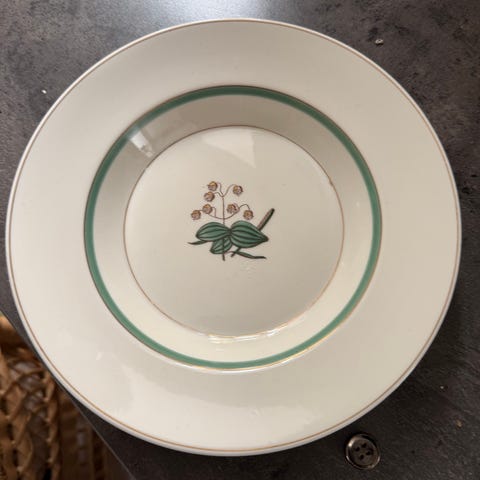 Bing & Grøndahl fad og tallerkener med grønt kantbånd og lille blomst i midten. Sættet har ovale og runde dele, som passer fint sammen på bordet.