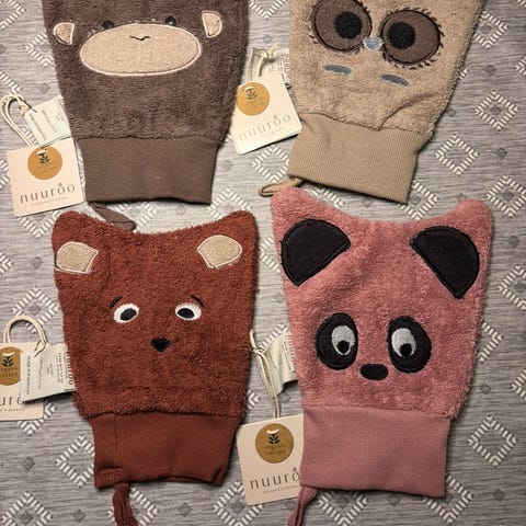 Blød fleece-agtig kvalitet og mærke siddende i et hjørne.