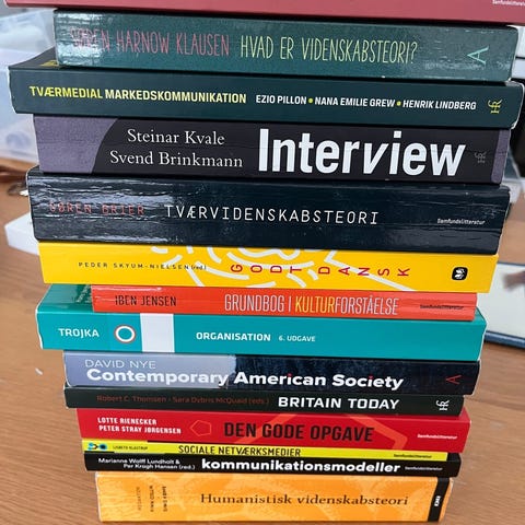 Samling af samfundsfagsbøger, bl.a. Global politik, Politics af Andrew Heywood, Det kritiske interview og Håndbog i Nudansk. Gode til studier med både teori om politik, spørgeskemaundersøgelser og interviewteknik.