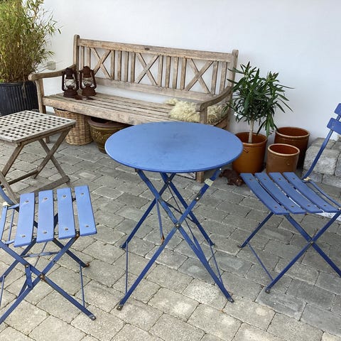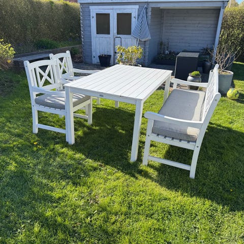 Havebordssæt med bænk og to stole i hvidmalet metal