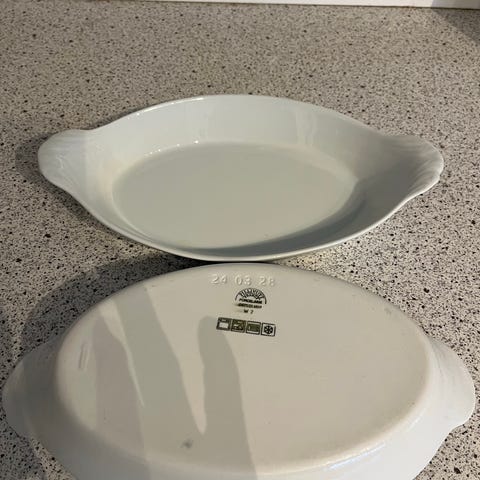 To kvadratiske fade fra Pillivuyt i hvid porcelæn 14 x 14cm. Med små håndtag i siderne.