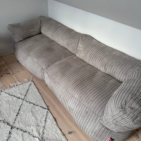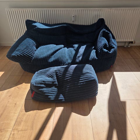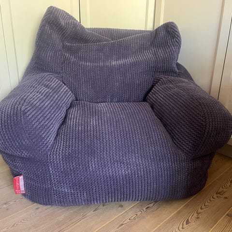Lounge Pug fra Big Bertha. En mindre sækkestol til 2-4 årige. Fejler intet, barnet er blot vokset fra den. Mørkeblå - jævn farve, ikke misfarvet af sol eller ligende (selvom det måske ligner det lidt på billederne). Kom med bud!