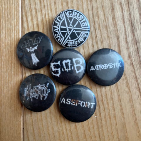 Samling af forskellige punk/rock band badges med tryk i flere farver.