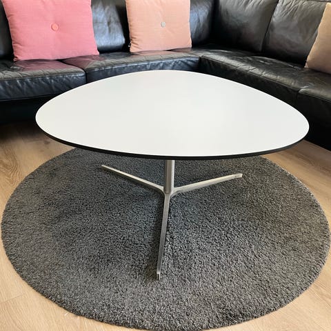 Sofabord fra ILVA udført i massiv hvid laminat med elegant sort kant og stel i børstet stål. Bordet fremstår i særdeles flot og velholdt stand uden ridser eller øvrige brugsspor og stammer fra et røg- og dyrefrit hjem.