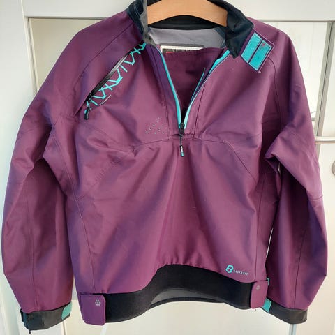 PEAK UK kajak-anorak str L i rød med sorte ærmer og detaljer. Har justerbare manchetter, halslukning og elastik i livet.