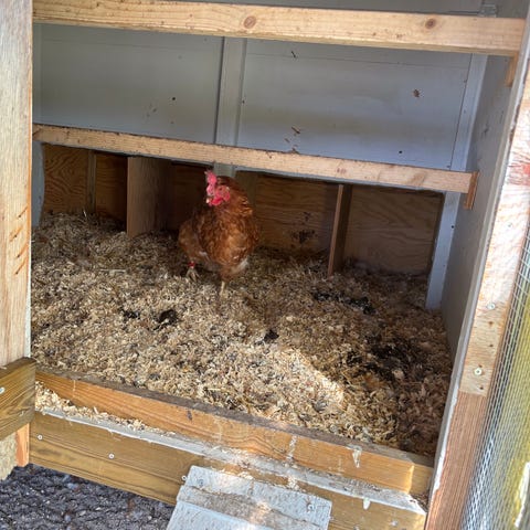 Hønsehus med tilhørende hønsegård i træ og net, klar til at blive sat op i haven. Der er låge foran, siddepinde og ophængt foder-/vandsystem inde i huset.